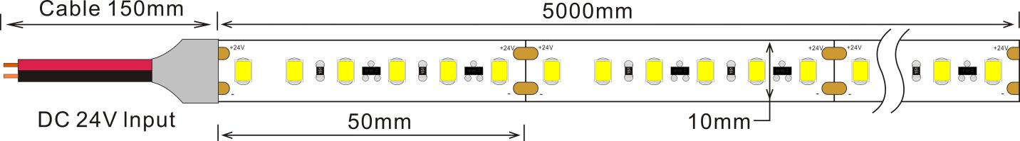 نوار LED انعطافپذیر SMD2835 با ۱۲۰ عدد LED در متر، ولتاژ مستقیم ۲۴ ولت، عرض ۱۰ میلیمتر، تکرنگ برای تزئین
